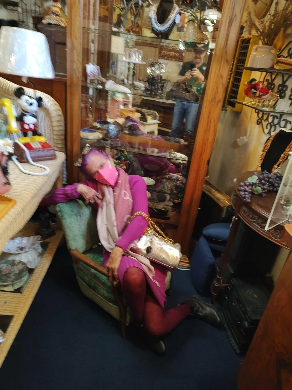 Image description: Person in pink mask is sitting in a chair with a background of an antiques shop.